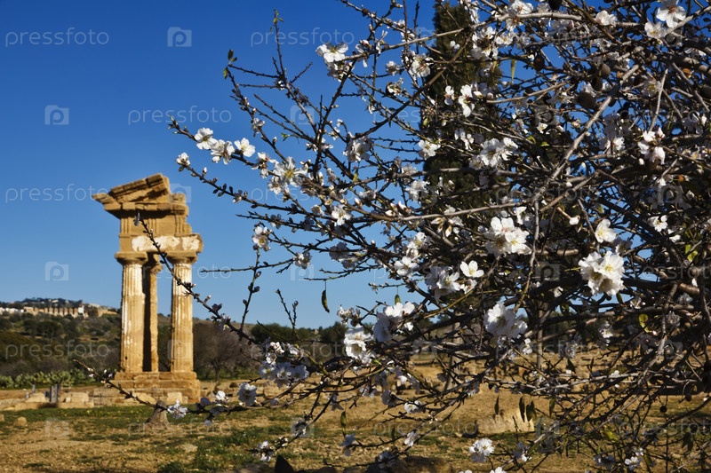 Италия, Сицилия, Агридженто, Долина греческих храмов, миндальное дерево с цветами и храм Геры