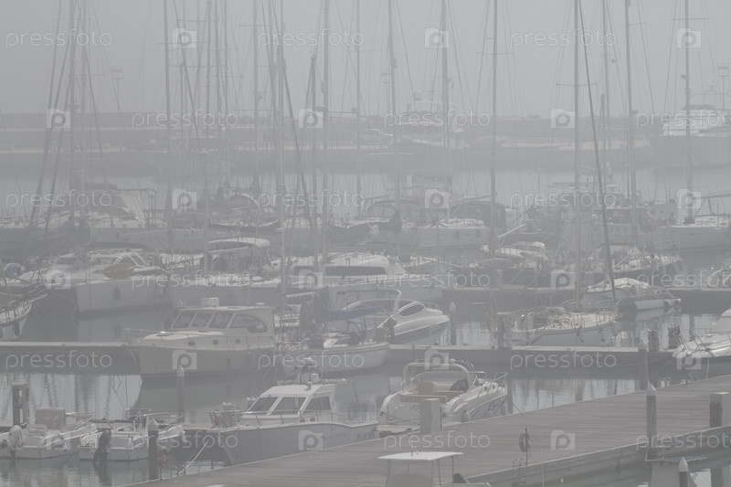 Италия, Сицилия, Средиземное море, Марина ди Рагуза, роскошные яхты в гавани в туманный день