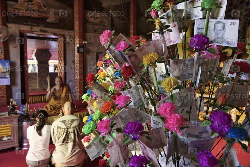 Таиланд, Чианг Май, Пратхат Дой Сутеп, буддийский храм, тайские баты, предложенные верующими, и буддийский монах на заднем плане