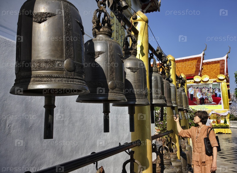 Таиланд, Чианг Май, буддийский храм Пратхат Дой Сутеп, тайская женщина звонит в религиозный колокол