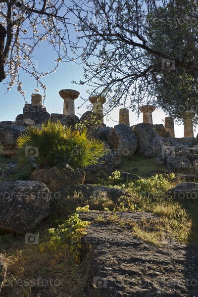 Италия, Сицилия, Агридженто, Долина греческих храмов, миндальное дерево с цветами и колонны храма Геркулеса на заднем фоне