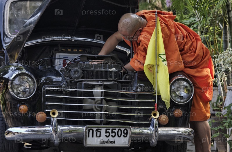Таиланд, Чианг Май, буддийский монах пытается починить двигатель своего старого автомобиля