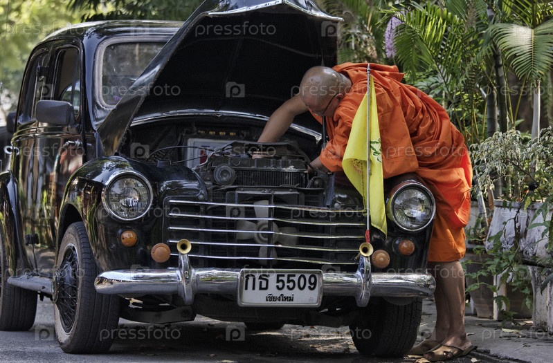 Таиланд, Чианг Май, буддийский монах пытается починить двигатель своего старого автомобиля