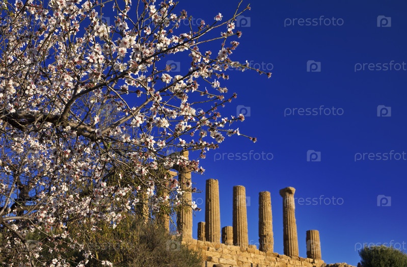 Италия, Сицилия, Агридженто, Долина греческих храмов, ветки миндаля и храм Джуно (480-420 до н.э.) на заднем плане