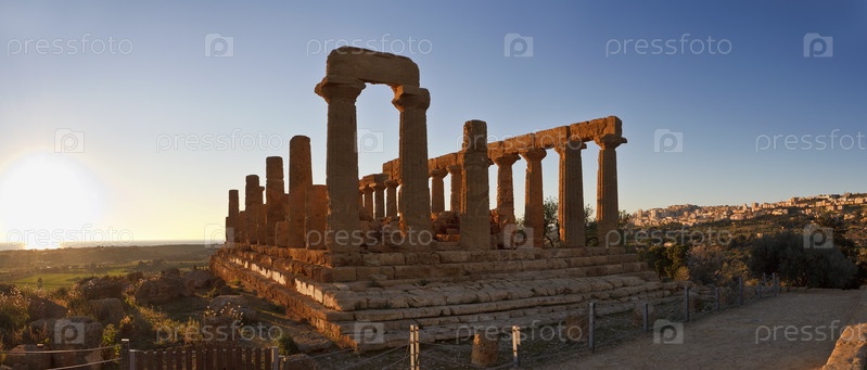 Италия, Сицилия, Агридженто, Долина греческих храмов, храм Темпл и город Агригенто (480-420 до н.э.) на закате