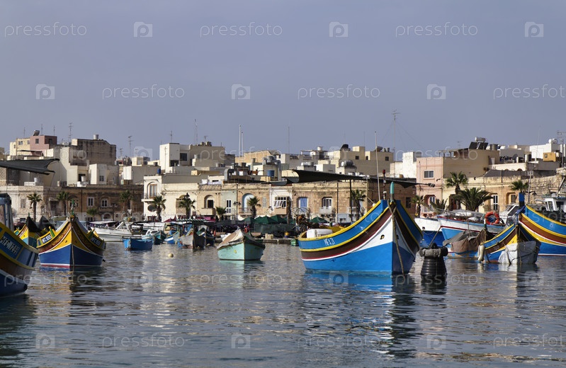 Остров Мальта, Марсашлокк, вид на город и деревянные рыбацкие лодки в гавани