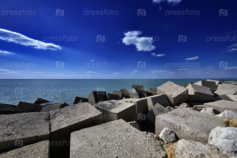 Италия, Сицилия, Средиземное море, бетонные блоки в порту города Скоглитти (провинция Рагуза)