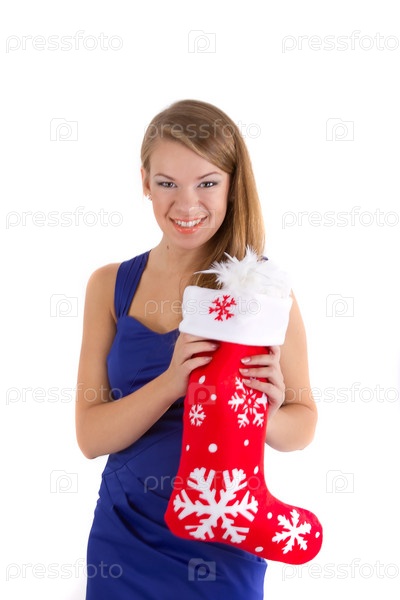 Улыбающаяся девушка держит красный рождественский носок