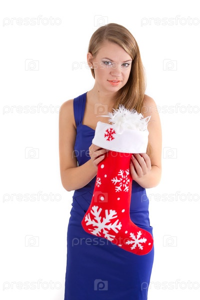 Улыбающаяся девушка держит красный рождественский носок