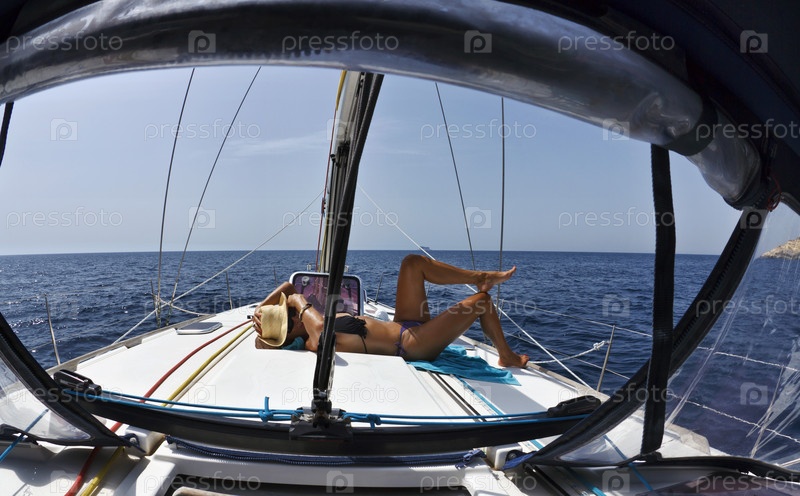 Средиземное море у южного побережья острова Мальта, женщина на парусной лодке