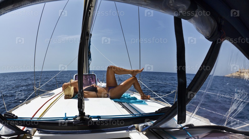 Средиземное море у южного побережья острова Мальта, женщина на парусной лодке