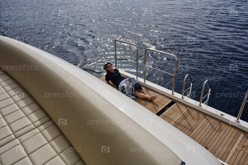 Италия, Тоскана, остров Эльба, роскошная яхта Азимут 75', женщина отдыхает на кормовой палубе