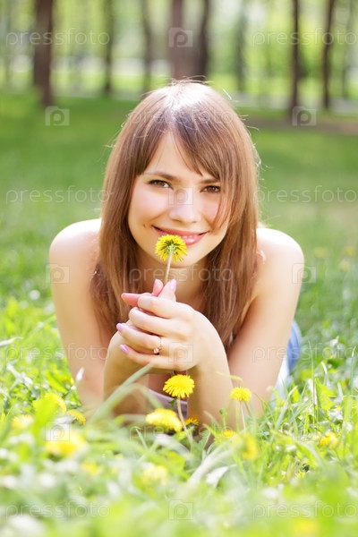 Красивая молодая девушка лежит на траве