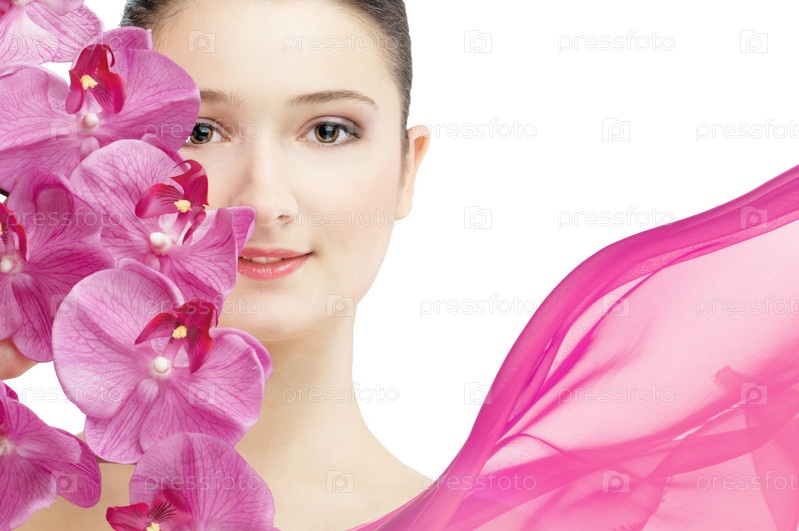 Красивая девушка с орхидеями на белом фоне