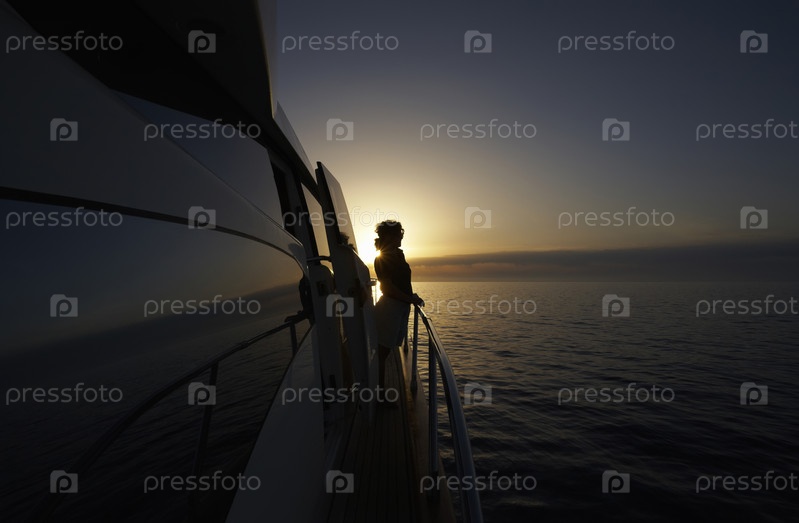 Италия, Средиземное море, роскошная яхта, женщина на борту на закате
