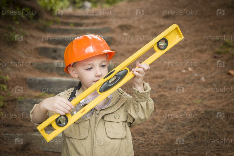 Прелестный мальчик с уровнем играет в строителя