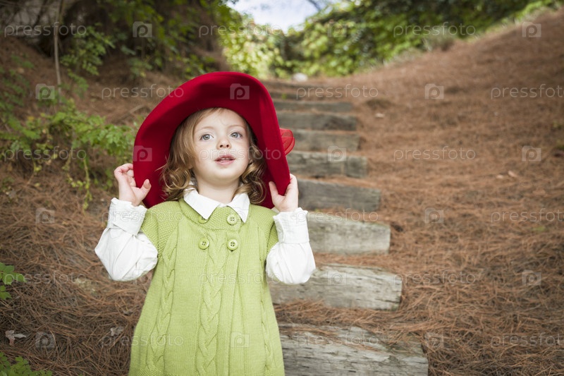 Очаровательная девочка в красной шляпе играет на улице