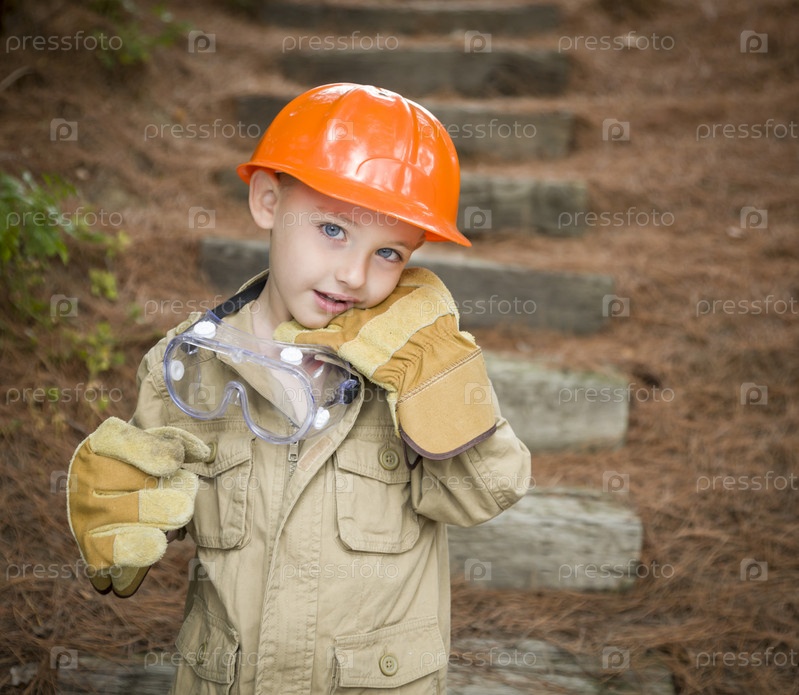 Прелестный мальчик с большими перчатками играет в рабочего