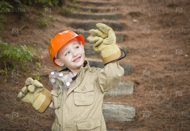 Прелестный мальчик с большими перчатками играет в разнорабочего
