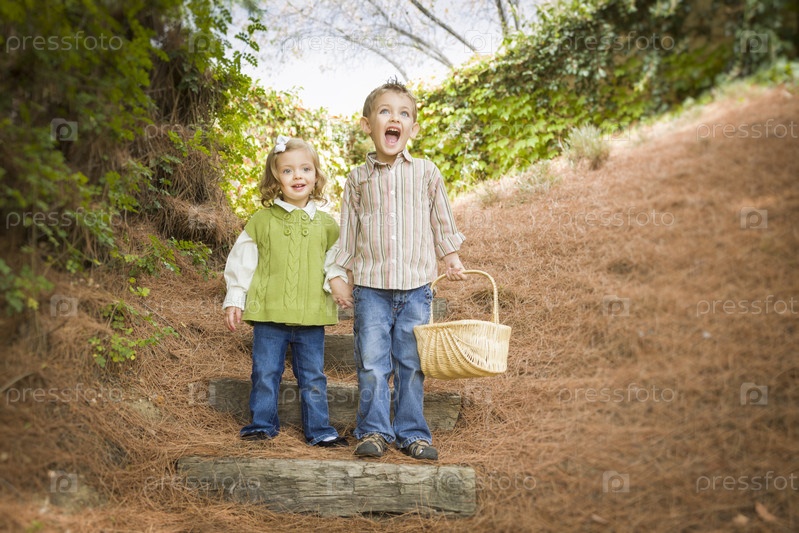 Двое детей идут по лестнице с корзиной