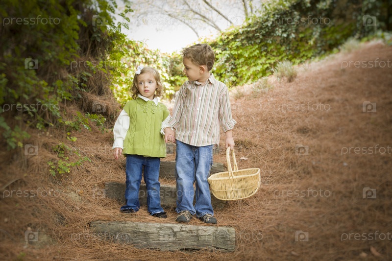 Двое детей идут по лестнице с корзиной