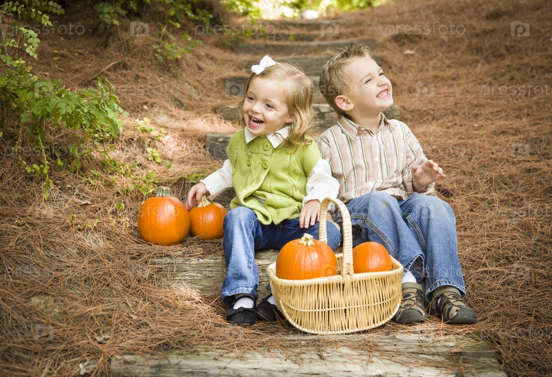 Брат и сестра сидят на деревянных ступенях с тыквами