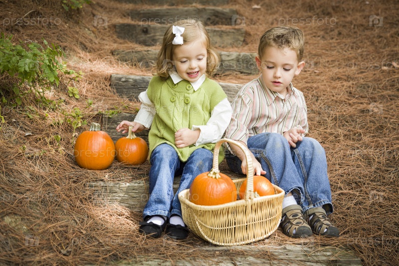 Брат и сестра сидят на деревянных ступенях с тыквами