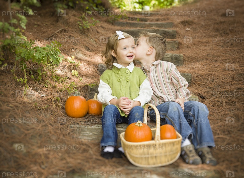 Брат и сестра сидят на деревянных ступенях с тыквами