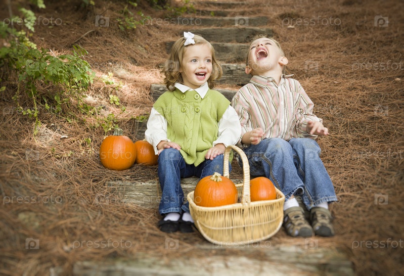 Брат и сестра сидят на деревянных ступенях с тыквами