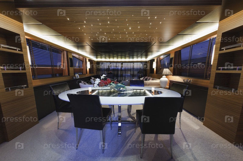 Италия, Тоскана, Виареджо, стол в столовой роскошной яхты Текномар Велвет 100'