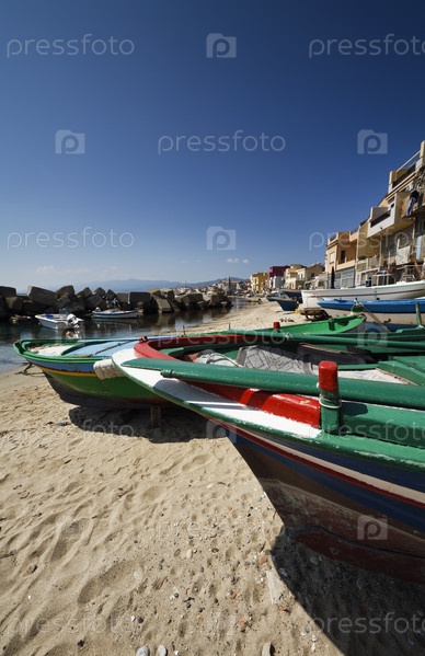 Италия, Сицилия, Мессина, Торре Фару, Сицилийский пролив, вид на город и рыбацкие лодки на пляже