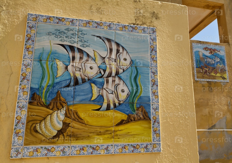 Италия, Сицилия, Мессина, Торре Фаро, морская картина на стене дома у моря