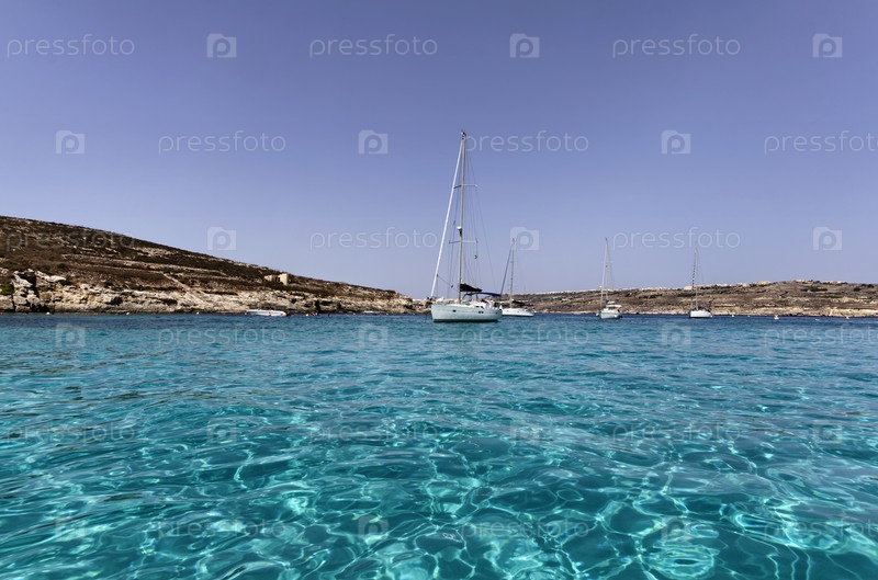 Остров Мальта, парусные лодки в кристально чистой воде лагуны Комино