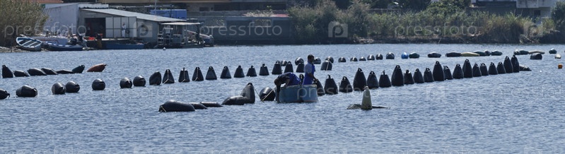Италия, Сицилия, Мессина, озеро Ганцирри, рыбаки, работающие в ферме мидий