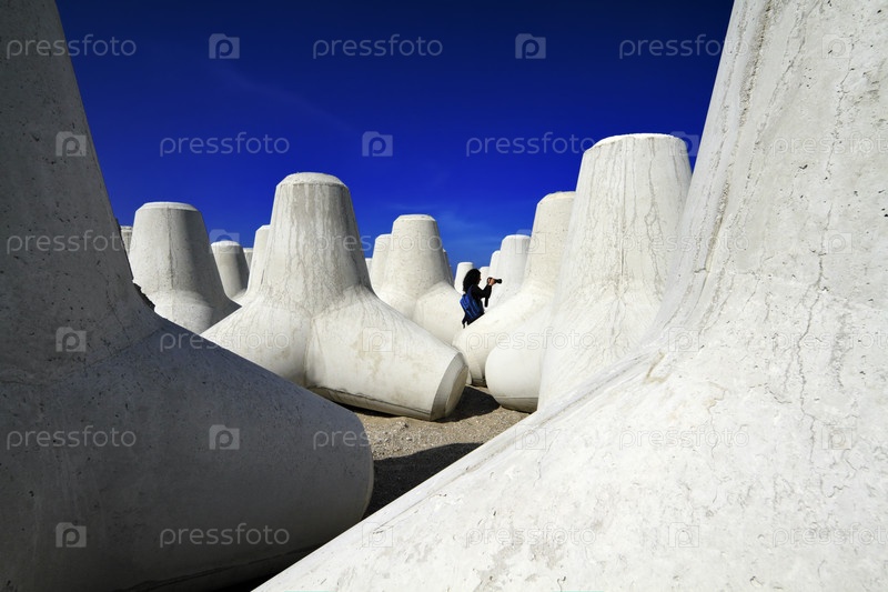 Италия, Сицилия, провинция Мессина, бетонные тетраподы на пляже вблизи строящегося порта