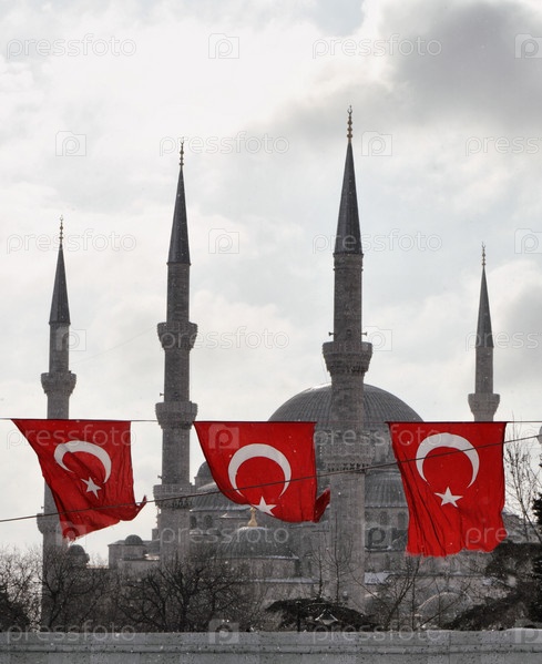 Турция, Стамбул, турецкие флаги и собор Святой Софии на закате (построен в IV веке Константином Великим и реконструирован в VI веке Юстинианом)