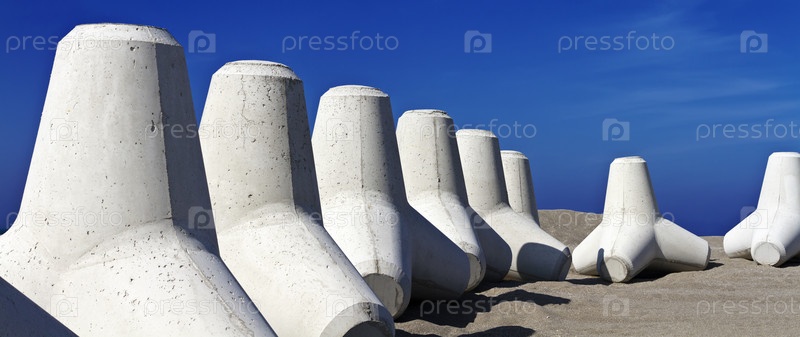 Италия, Сицилия, провинция Мессина, бетонные тетраподы на пляже вблизи строящегося порта