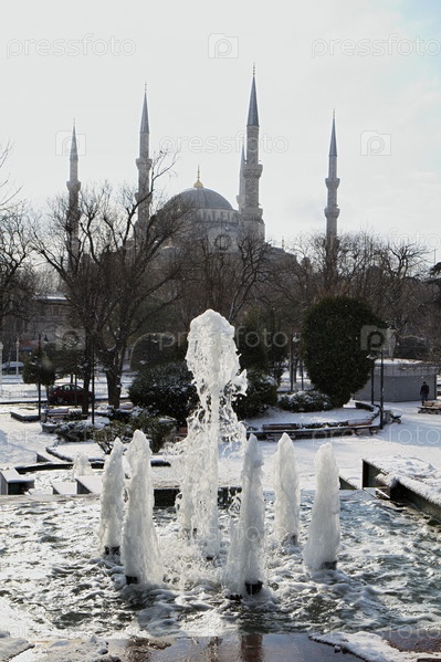 Стамбул, Турция, фонтан и Императорская мечеть Султанахмета, также известная как Голубая Мечеть, построенная в XVII веке по проекту архитектора Мехмета