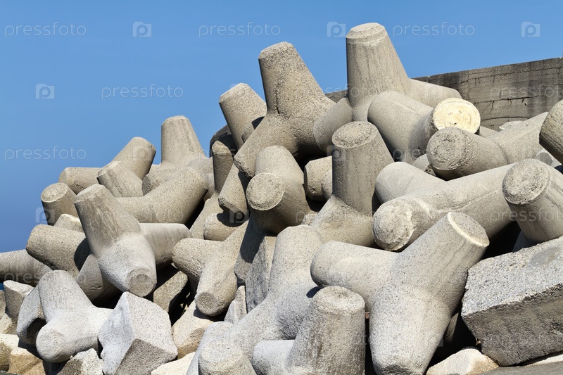 Италия, Сицилия, провинция Мессина, бетонные тетраподы на пляже вблизи строящегося порта