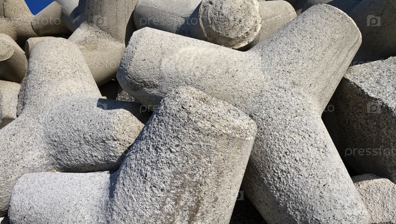 Италия, Сицилия, провинции Мессина, бетонные тетраподы на пляже вблизи строящегося порта