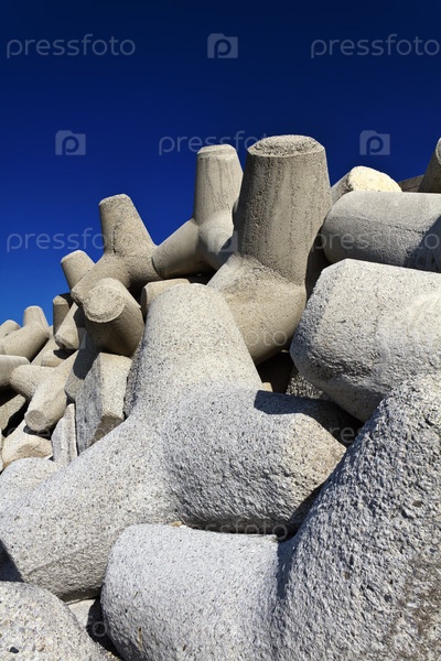 Италия, Сицилия, провинция Мессина, бетонные тетраподы на пляже вблизи строящегося порта