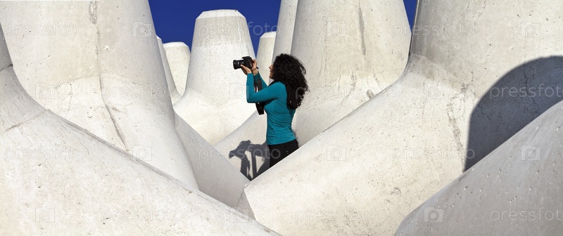 Италия, Сицилия, провинция Мессина, бетонные тетраподы на пляже вблизи строящегося порта