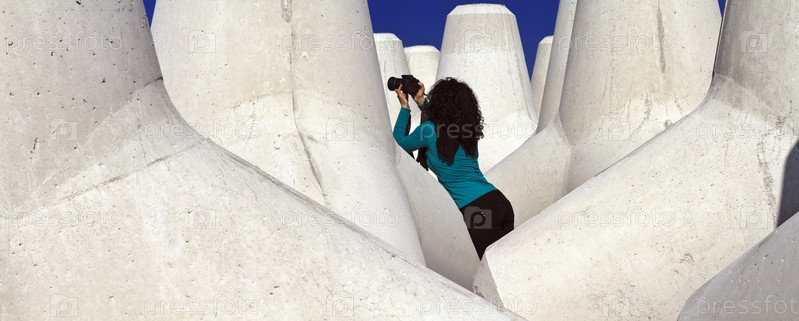 Италия, Сицилия, провинция Мессина, бетонные тетраподы на пляже вблизи строящегося порта
