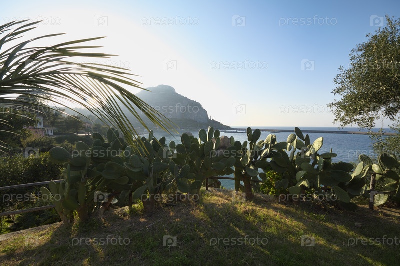 Италия, Сицилия, Чефалу, опунции и порт на заднем плане