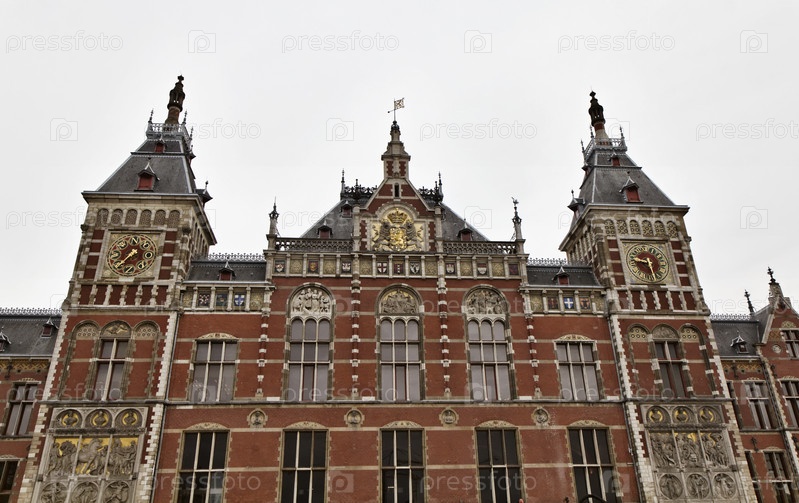 Голландия, Амстердам, вид на фасад центрального железнодорожного вокзала
