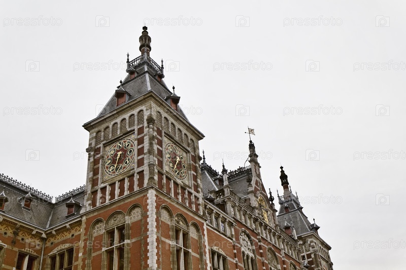 Голландия, Амстердам, вид на фасад центрального железнодорожного вокзала
