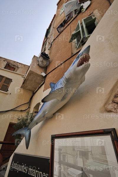Франция, Корсика, Бонифацио, искусственная акула на стене магазина