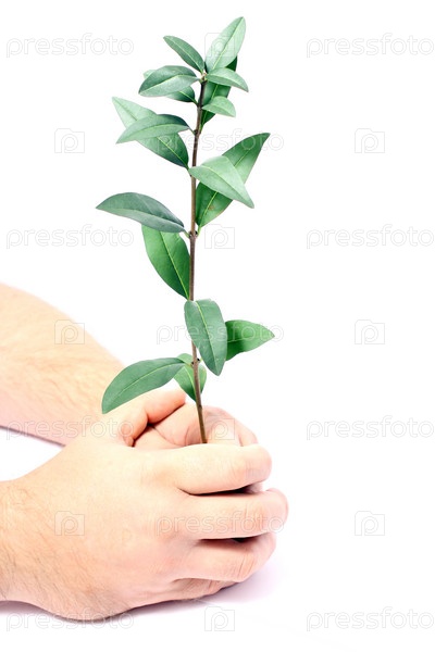 Мужские руки и ветвь с зелеными листьями, изолированные на белом фоне