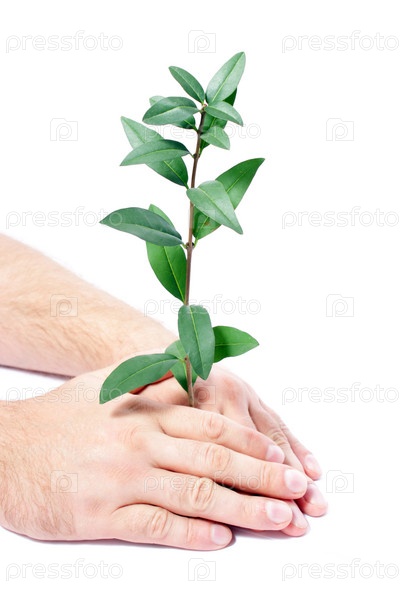 Мужские руки и ветвь с зелеными листьями, изолированные на белом фоне