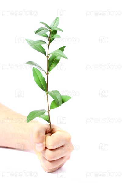 Мужская рука и ветвь с зелеными листьями, изолированные на белом фоне